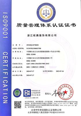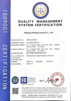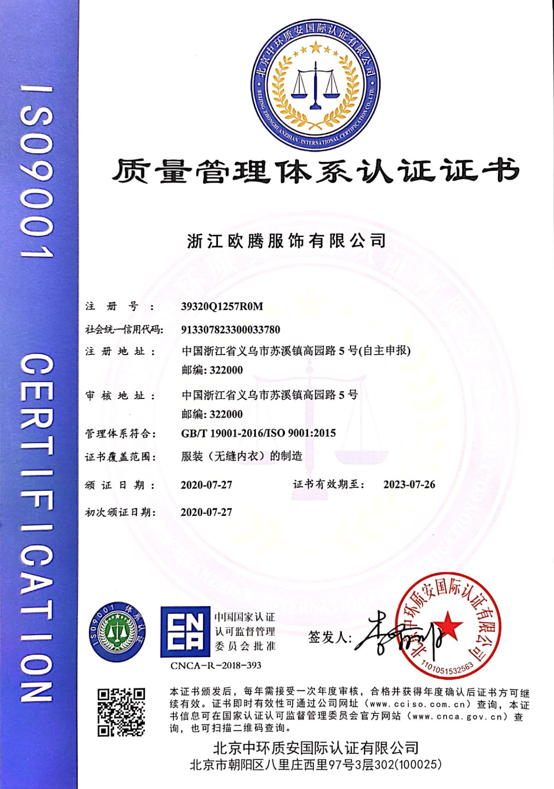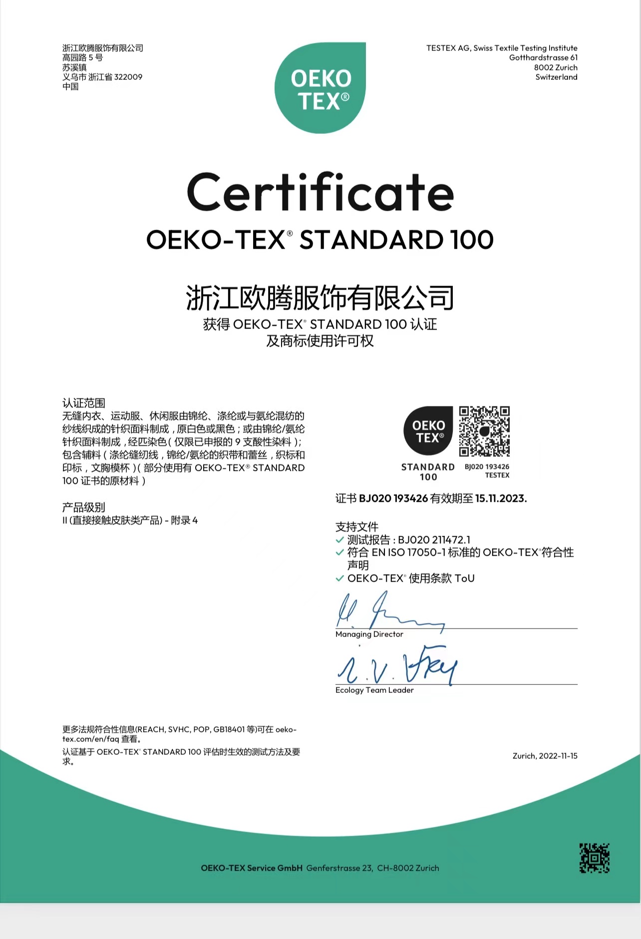 浙江歐騰服飾有限公司位于世界小商品之都-義烏。創(chuàng)立于2015年,是一家專業(yè)生產(chǎn)無縫針織運動服飾和內衣的工貿(mào)一體企業(yè),擁有自主出口權。 工廠的占地面積約16000平方米 ,引進了大型圣東尼、高騰等多種先進的制衣設備300余臺。月產(chǎn)能可達90萬件。 歐騰服飾每年投入近百萬資金打樣開發(fā)新產(chǎn)品,有著一支高素質設計、技術員工隊伍。工廠先后通過了ISO 9001質量管理體系認證、BSCI認證、GRS認證、OEKO-TEX國際生態(tài)紡織品認證等多項專利檢測報告。可提供OEM&ODM服務。歐騰服飾以一套完整、科學的質量管理體系,生產(chǎn)的服裝從原材料紗線到成衣,質量完全能夠滿足國內、國際質量要求。獲得了客戶一致好評。工廠先后獲得省科技型企業(yè)、國家高新企業(yè)、義烏市誠信講信用單位、規(guī)上企業(yè)、信用AAA級等榮譽。